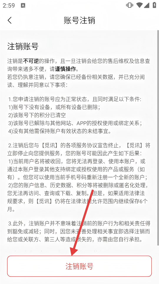4、進(jìn)入“賬號注銷”頁面,仔細(xì)閱讀注銷須知后,點(diǎn)擊【注銷賬號】,完成賬號注銷操作。