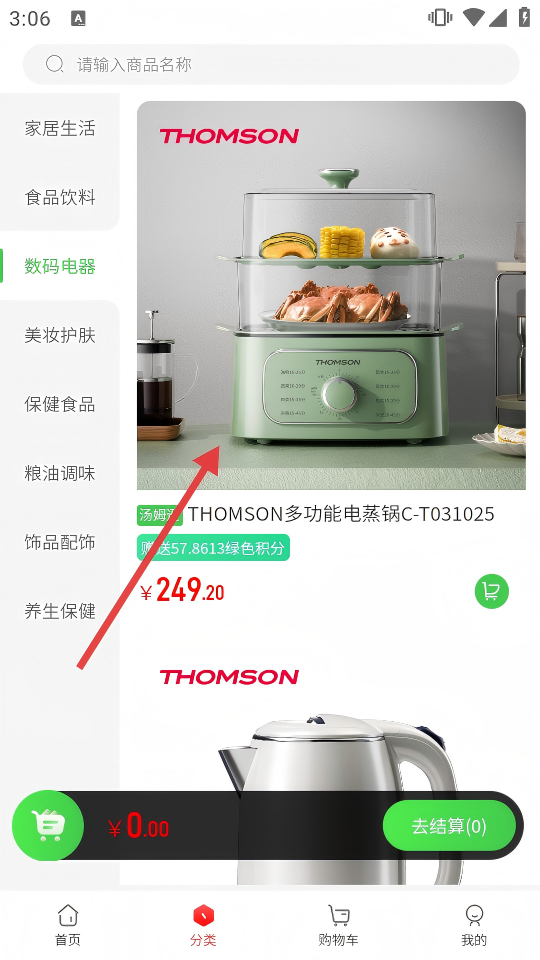2、在分類頁面,選擇【數(shù)碼電器】分類,找到THOMSON多功能電蒸鍋。