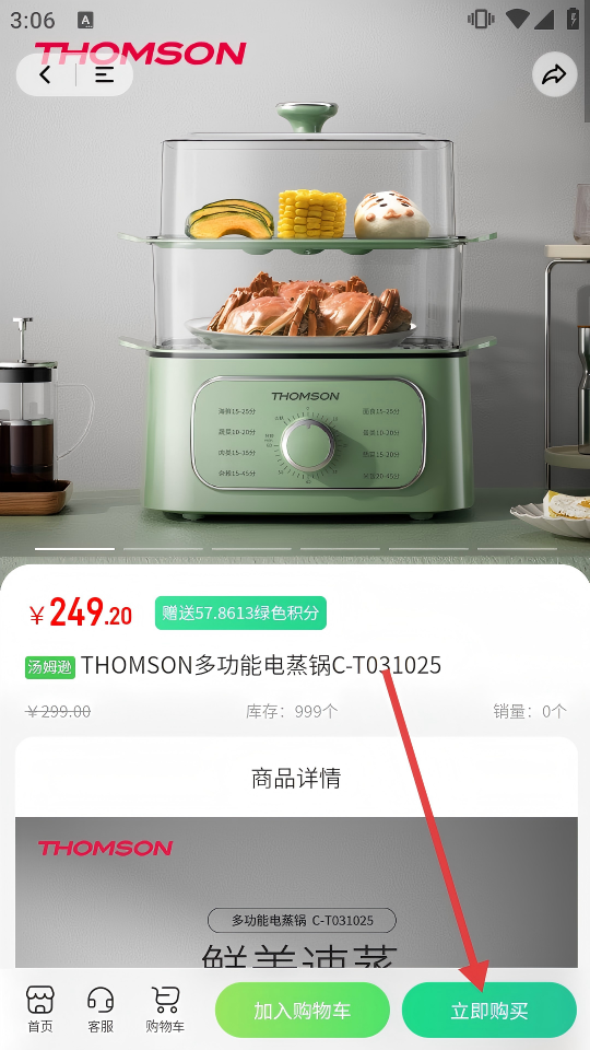 3、進(jìn)入電蒸鍋商品詳情頁,點(diǎn)擊【立即購買】,跳轉(zhuǎn)至登錄頁面。