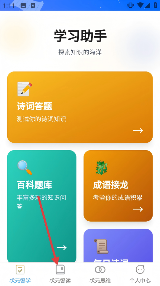 1、打開(kāi)學(xué)習(xí)類(lèi)APP,點(diǎn)擊底部【狀元智讀】,進(jìn)入智讀頁(yè)面。
