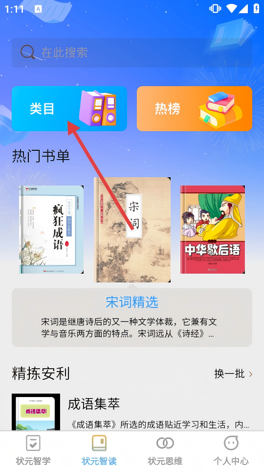 2、在智讀頁(yè)面,點(diǎn)擊【類(lèi)目】,進(jìn)入書(shū)籍分類(lèi)界面。