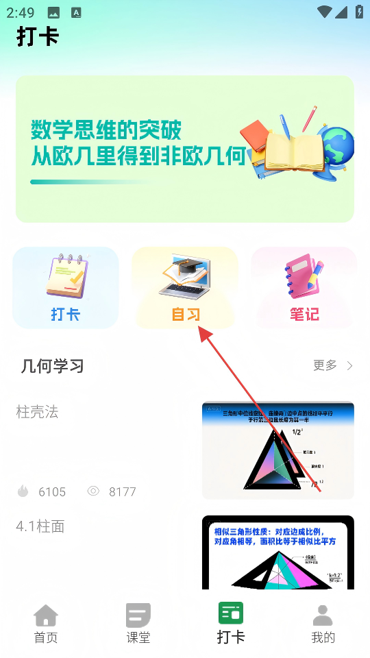 2、在打卡頁(yè)面點(diǎn)擊【自習(xí)】,進(jìn)入自習(xí)時(shí)間選擇頁(yè)面。