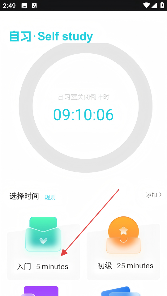 3、在自習(xí)時(shí)間選擇頁(yè)面點(diǎn)擊【入門5minutes】,進(jìn)入自習(xí)計(jì)時(shí)界面。