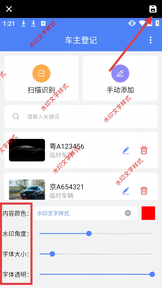 4、在水印文字樣式設(shè)置頁(yè),可調(diào)整【內(nèi)容顏色】【水印角度】【字體大小】【字體透明】等,設(shè)置好后點(diǎn)擊右上角保存圖標(biāo)完成操作。