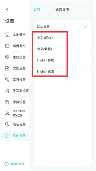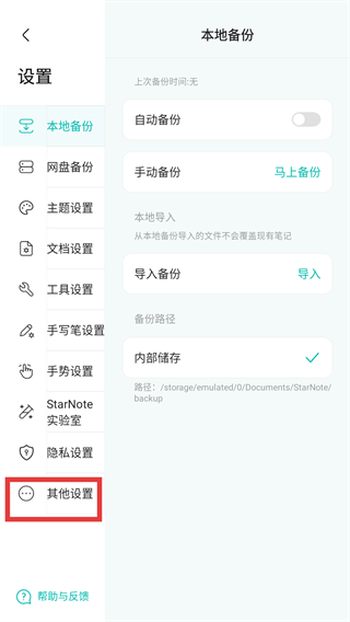1、在StarNote主界面,點(diǎn)擊左上角的設(shè)置圖標(biāo),進(jìn)入應(yīng)用的設(shè)置功能頁(yè)面,可進(jìn)行各類配置操作。