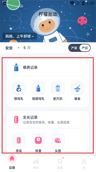 1、在“記錄”頁(yè)面,可通過(guò)【喂養(yǎng)記錄】選擇喂母乳、輔食等喂養(yǎng)方式,也能在【生長(zhǎng)記錄】中記錄寶寶身高、體重等信息。