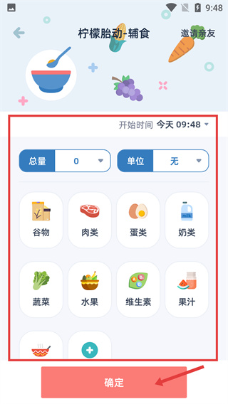 2、進(jìn)入“檸檬胎動(dòng)-輔食”頁(yè)面,設(shè)置【總量】、【單位】,選擇輔食類型,完成后點(diǎn)擊【確定】保存輔食記錄。