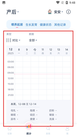 3、在“統(tǒng)計(jì)”頁(yè)面的【喂養(yǎng)起居】分類下,可查看當(dāng)日時(shí)間軸式的喂養(yǎng)數(shù)據(jù),以及本周各類育兒行為的統(tǒng)計(jì)情況。