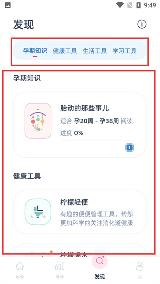 4、在“發(fā)現(xiàn)”頁(yè)面,可通過(guò)【孕期知識(shí)】學(xué)習(xí)對(duì)應(yīng)孕周內(nèi)容,也能使用【健康工具】等功能輔助孕期及育兒管理。