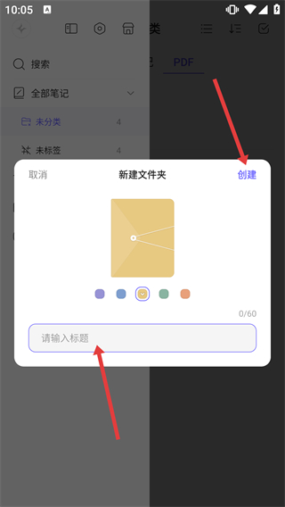 4、在新建文件夾彈窗的輸入框填寫標(biāo)題,選擇樣式后點(diǎn)擊【創(chuàng)建】按鈕,完成文件夾的新建操作。