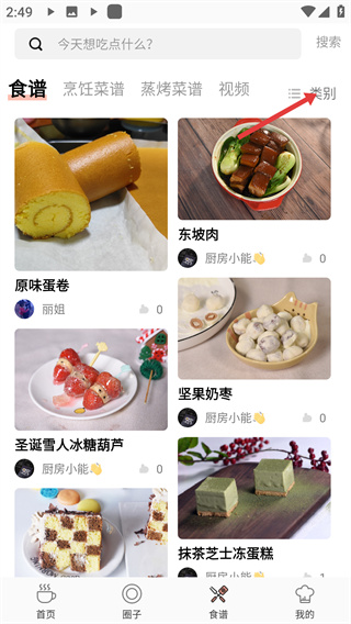 1、進(jìn)入【食譜】頁(yè)面,點(diǎn)擊右上角的【類別】按鈕,打開食譜分類彈窗,可按不同品類篩選目標(biāo)食譜。