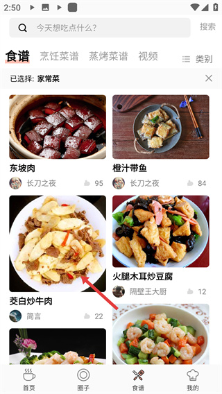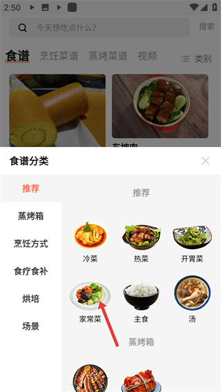 2、在食譜分類彈窗中,選定【家常菜】類別,系統(tǒng)將自動(dòng)篩選并展示對(duì)應(yīng)的家常菜食譜列表。