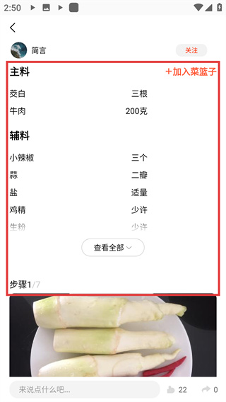 4、在【茭白炒牛肉】的食譜詳情頁(yè),可查看主料、輔料以及步驟信息,點(diǎn)擊【+加入菜籃子】能將食材添加至菜籃子。