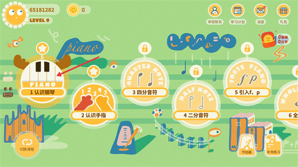2、處于LEVEL-0界面時,圍繞【piano】開展學(xué)習(xí),先完成【1-認(rèn)識鋼琴】模塊,再推進【2-認(rèn)識手指】等后續(xù)學(xué)習(xí)內(nèi)容。