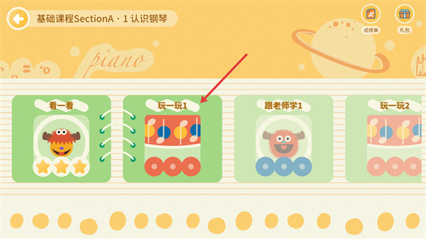 3、進入【基礎(chǔ)課程Section-A-1-認(rèn)識鋼琴】后,先體驗【看一看】環(huán)節(jié),再參與【玩一玩1】模塊完成對應(yīng)的互動練習(xí)。
