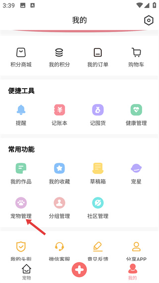 1、在“我的”頁面常用功能板塊中找到【寵物管理】并點(diǎn)擊,進(jìn)入對(duì)應(yīng)的寵物相關(guān)管理操作界面。