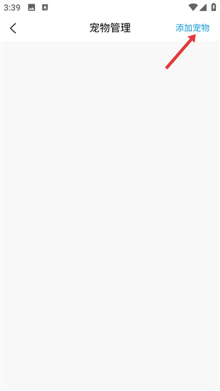 2、進(jìn)入【寵物管理】頁面后,點(diǎn)擊右上角的【添加寵物】選項(xiàng),開啟寵物信息添加的操作流程。