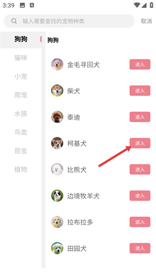 3、在寵物種類選擇界面中,找到【柯基犬】并點(diǎn)擊對(duì)應(yīng)的【進(jìn)入】按鈕,進(jìn)入該寵物的專屬詳情頁面。