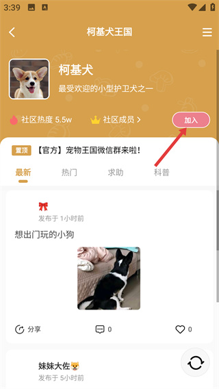 4、進(jìn)入【柯基犬王國】頁面后,點(diǎn)擊右上角的【加入】按鈕,即可完成該寵物社區(qū)的加入操作。