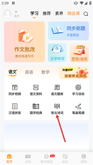 2、在學習頁面的語文板塊中,點擊【背古詩詞】功能入口,可進入對應的古詩學習資源頁面。