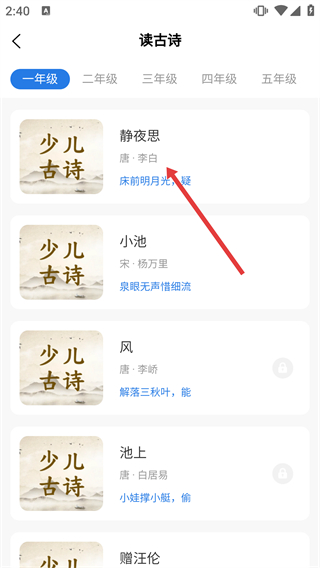 3、進入讀古詩頁面后,選擇一年級分類下的【靜夜思】選項,可進入該古詩的詳情學習界面。