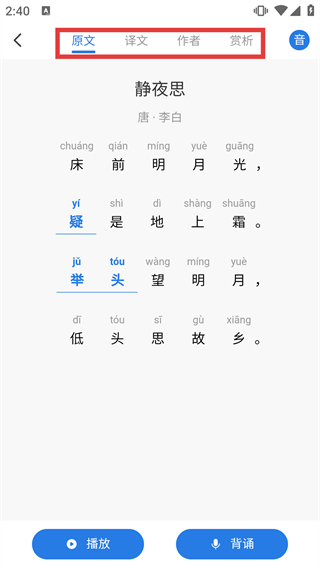 4、在《靜夜思》詳情頁,可切換【原文】【譯文】等板塊,還能通過【播放】【背誦】按鈕輔助學習。