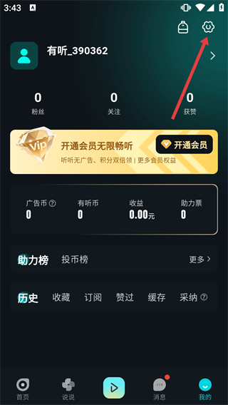 2、在“我的”頁(yè)面,點(diǎn)擊右上角的設(shè)置圖標(biāo),進(jìn)入應(yīng)用的設(shè)置配置頁(yè)面。