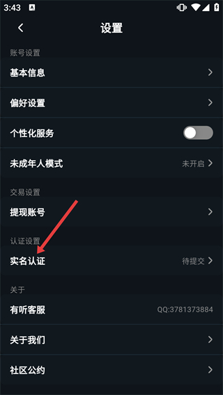 3、在設(shè)置頁(yè)面中,找到【實(shí)名認(rèn)證】選項(xiàng)并點(diǎn)擊,進(jìn)入實(shí)名認(rèn)證的信息提交界面。