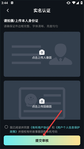 4、在實(shí)名認(rèn)證頁(yè)面,依次上傳身份證人像面、國(guó)徽面,勾選相關(guān)協(xié)議后點(diǎn)擊【提交審核】完成認(rèn)證申請(qǐng)。