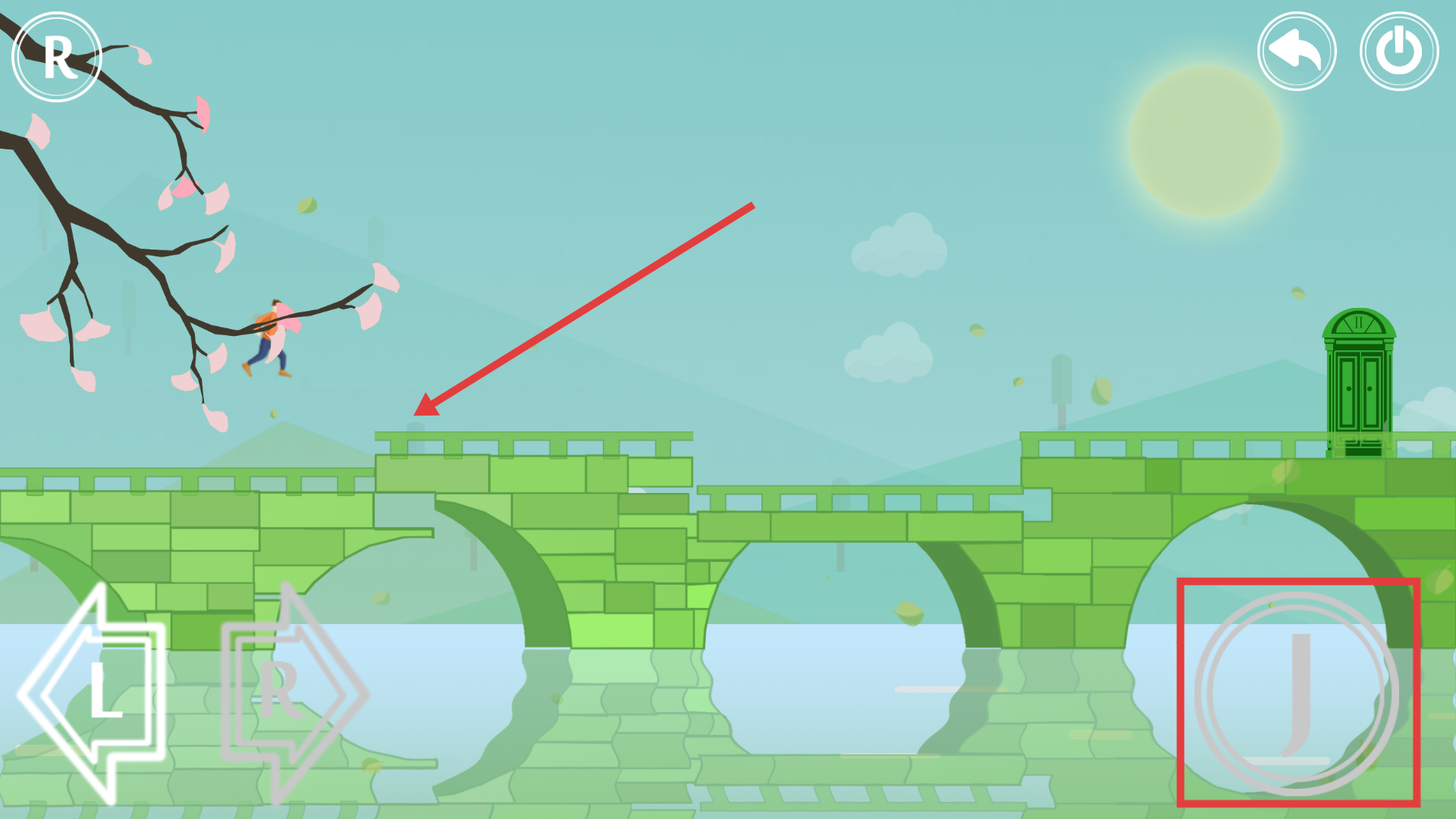 3、遇到斷橋時,點擊右下角【J】跳躍鍵,讓角色跳躍越過斷橋。
