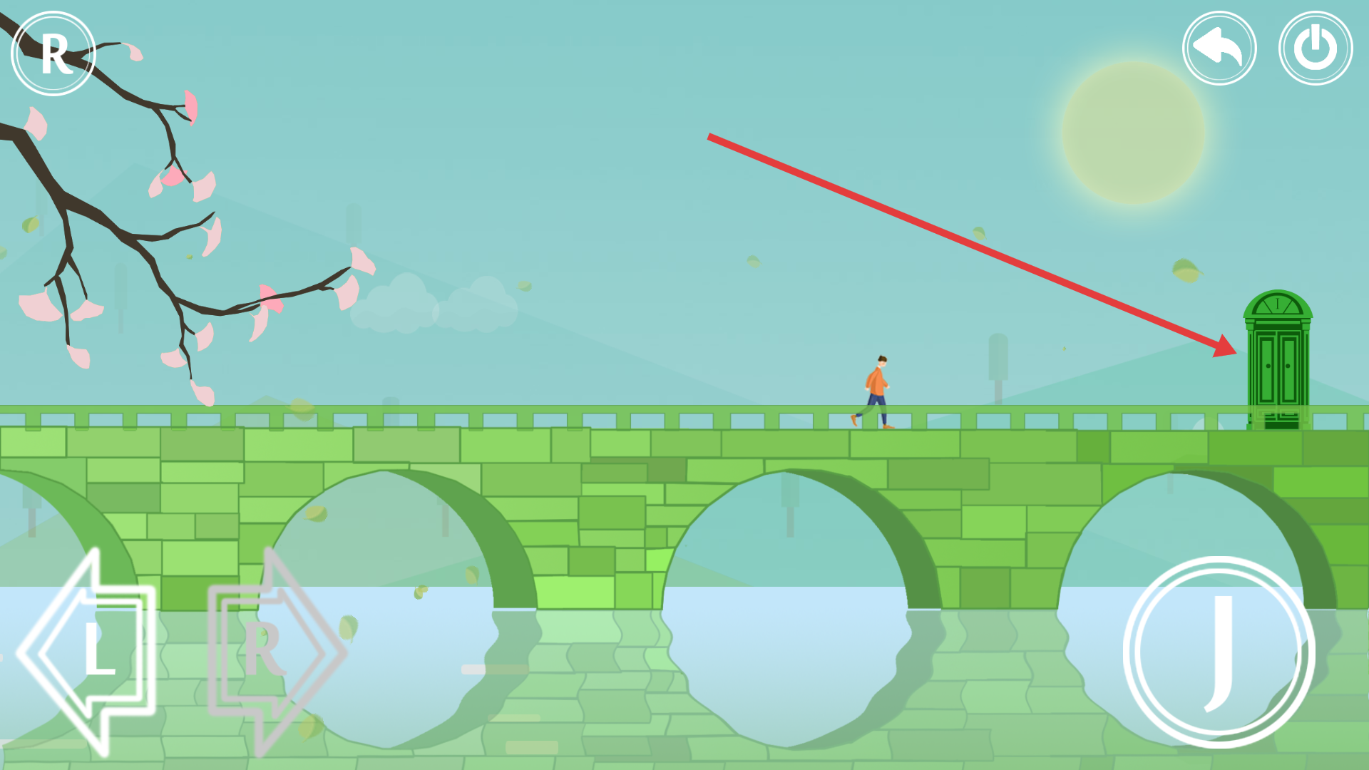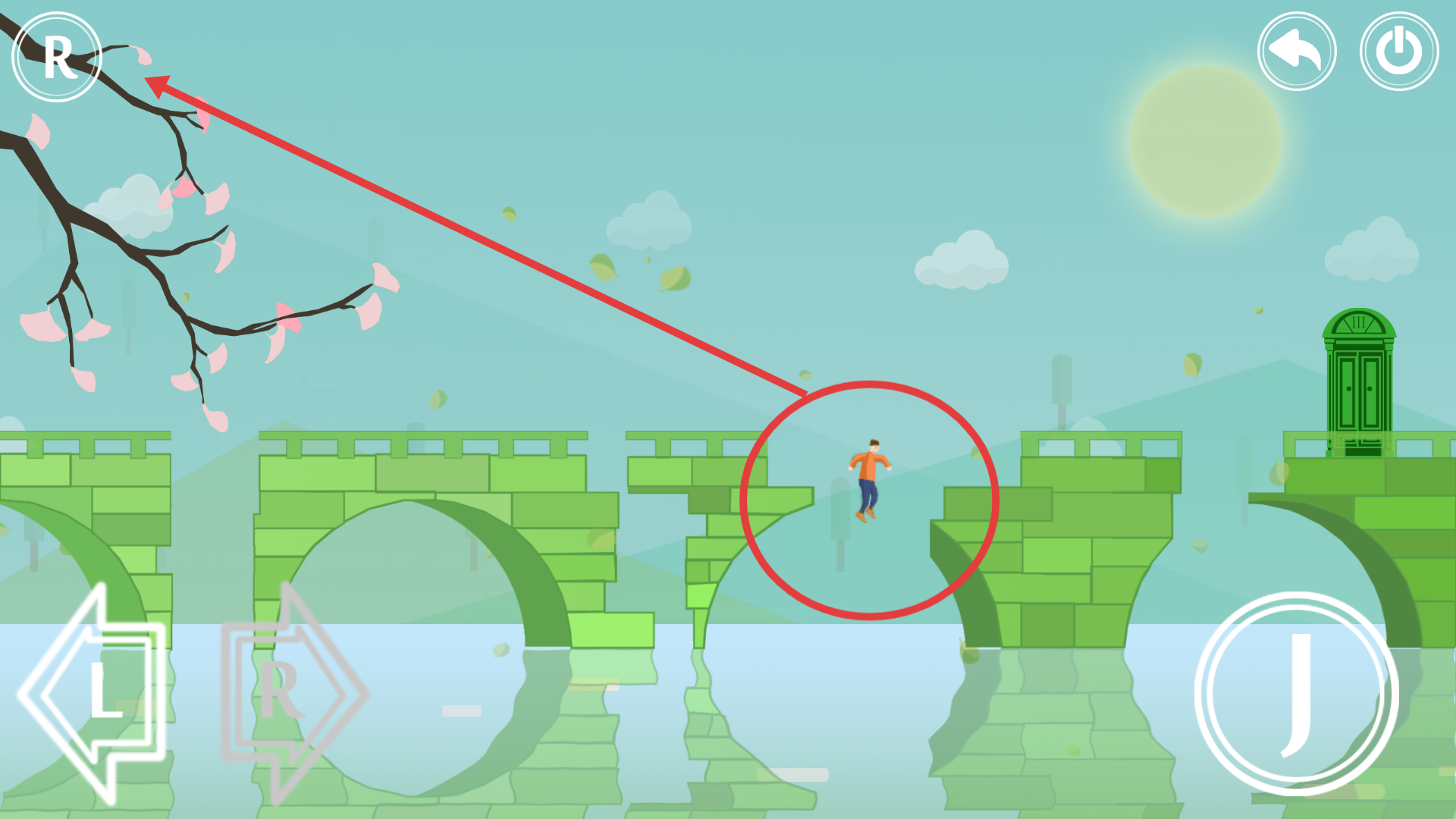 4、持續(xù)通過跳躍跨越斷橋,如果操作失誤可以點擊左上角的【R】鍵,重置本關卡,重新開始挑戰(zhàn)。
