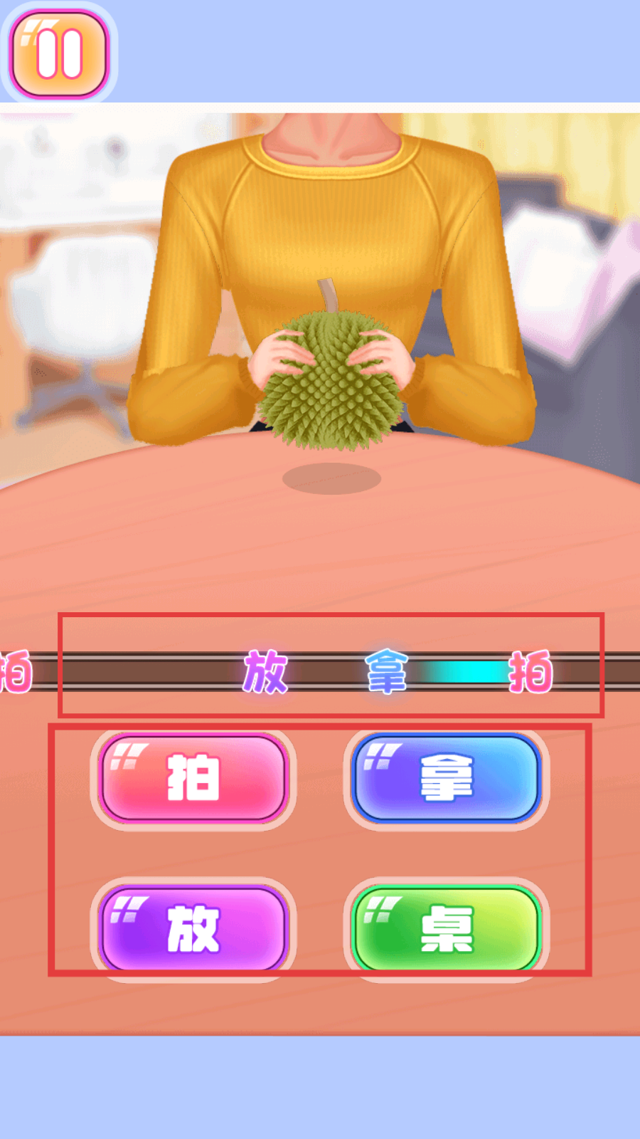 3、根據提示,需要點擊【拍】【拿】【放】【桌】按鈕,進行操作游戲。
