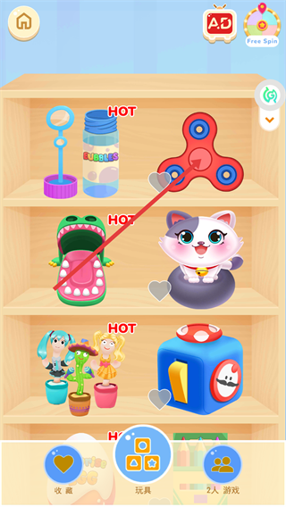 2、進(jìn)入玩具貨架界面,點(diǎn)擊標(biāo)有【HOT】的紅色指尖陀螺,選中該玩具。