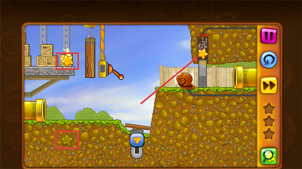 1、點(diǎn)擊黃色機(jī)械工具,移動(dòng)或操作場(chǎng)景中的木樁等物體,為蝸牛鮑勃開(kāi)辟路徑。
