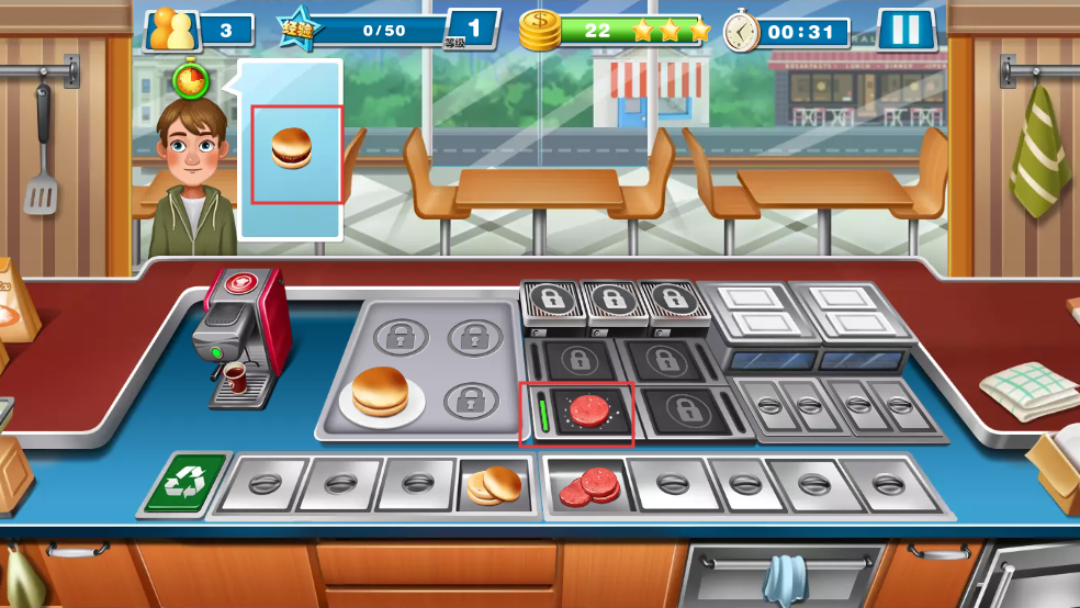 1、進(jìn)入作品后,在餐廳烹飪場景中,根據(jù)顧客需求,先在烤架上放置肉餅進(jìn)行烤制。