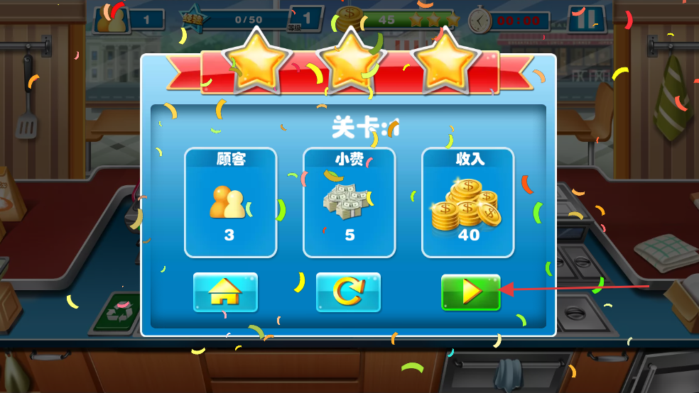 4、當(dāng)完成關(guān)卡內(nèi)的所有服務(wù)任務(wù)后,界面會顯示關(guān)卡結(jié)算信息,點(diǎn)擊綠色箭頭按鈕,可繼續(xù)挑戰(zhàn)下一個關(guān)卡。