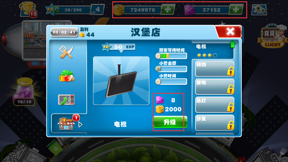 1、在漢堡店升級界面,點擊“升級”按鈕,對電視等店內設施進行升級,這個版本不用擔心金幣鉆石的消耗。
