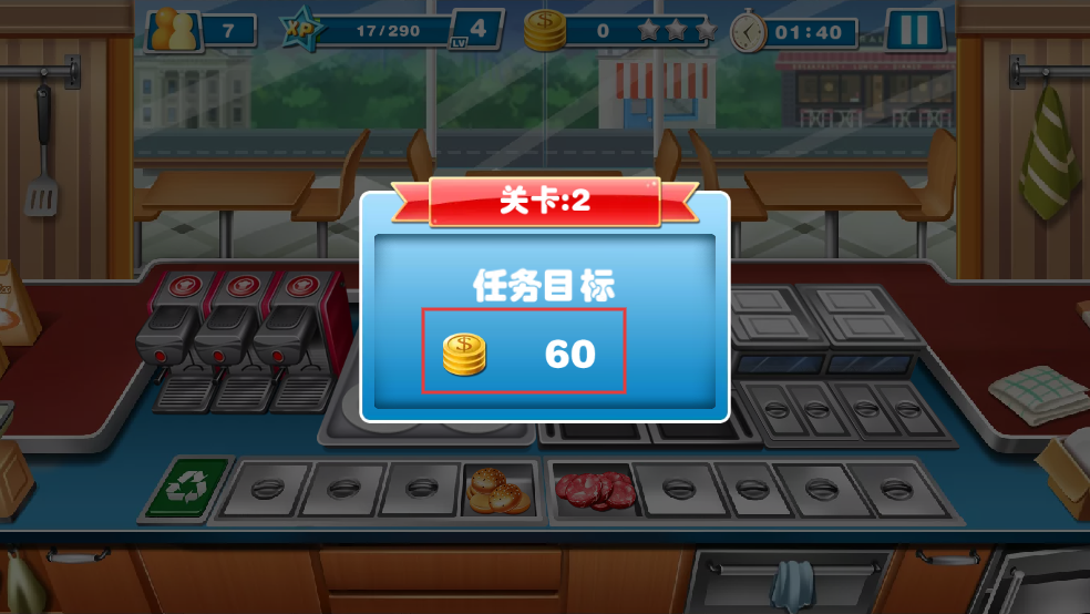 3、進入關卡2后,明確任務目標是獲得60金幣,開始在餐廳烹飪場景中,根據(jù)顧客需求制作食物。
