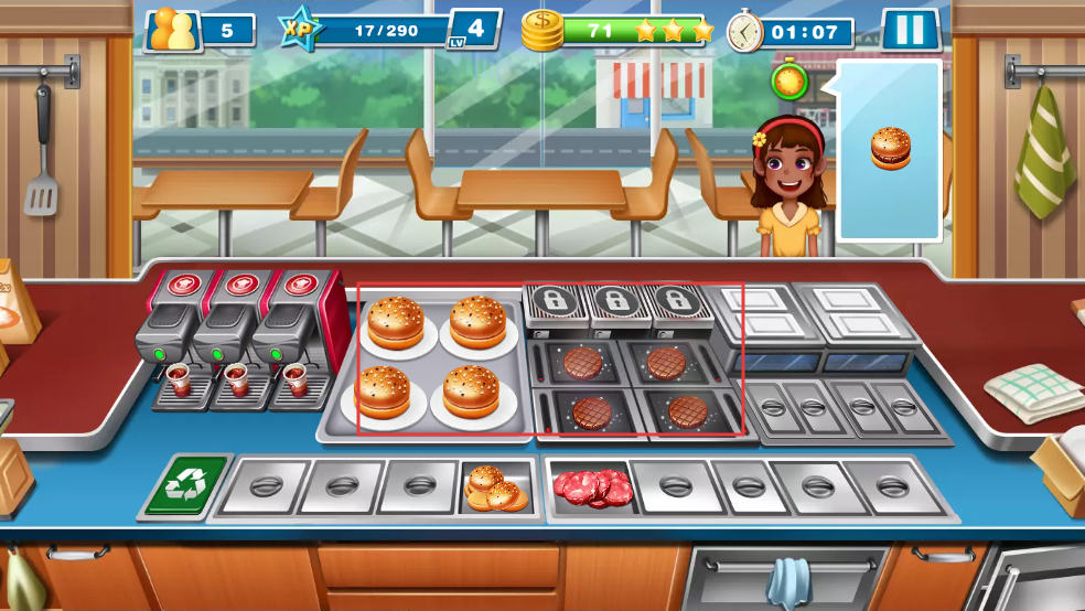 4、提前準備好漢堡胚和烤制好的肉餅等食材,組合成漢堡,然后遞給對應的顧客,通過服務顧客獲取金幣。