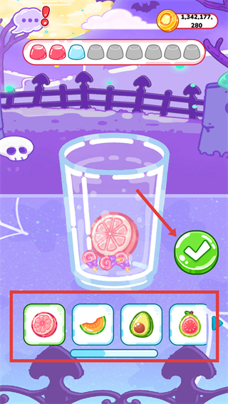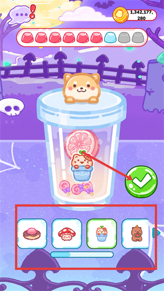 3、繼續(xù)在制作界面選擇指定配料(如貓咪樣式食材),選定后點(diǎn)擊綠色【對(duì)勾】按鈕,提升奶茶制作的進(jìn)度條。