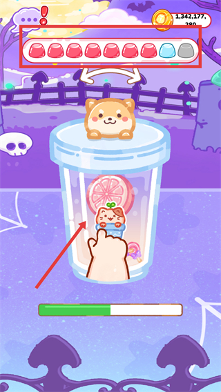 4、觀察上方進(jìn)度條的更新,點(diǎn)擊杯中對(duì)應(yīng)元素進(jìn)行調(diào)整,完成這一步操作搖晃奶茶制作的最終完成。
