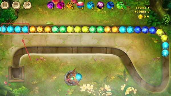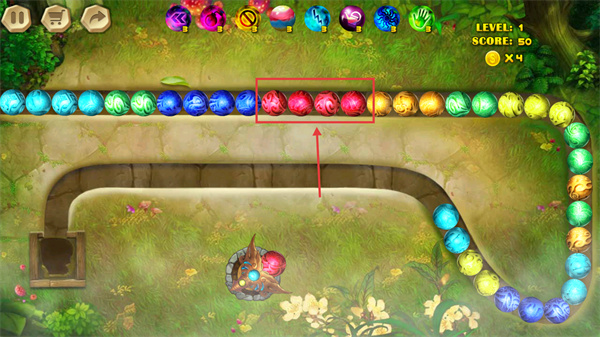 3、遇到連續(xù)同色球(如紅色球組)時(shí)精準(zhǔn)發(fā)射,消除該組可觸發(fā)連鎖反應(yīng),提升得分效率。