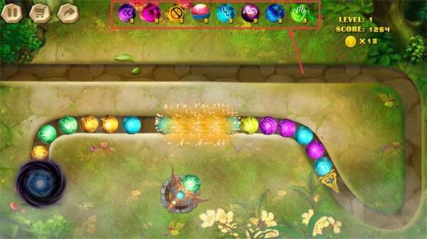 4、使用頂部【特殊技能球】可快速清除大片球鏈,關(guān)卡后期用其突破球鏈擁堵,加速通關(guān)。
