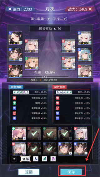 1、配置英雄陣容后需點擊【保存】確認(rèn)設(shè)置,以便在【第一章-第一關(guān)】的對決中生效,提升勝率。