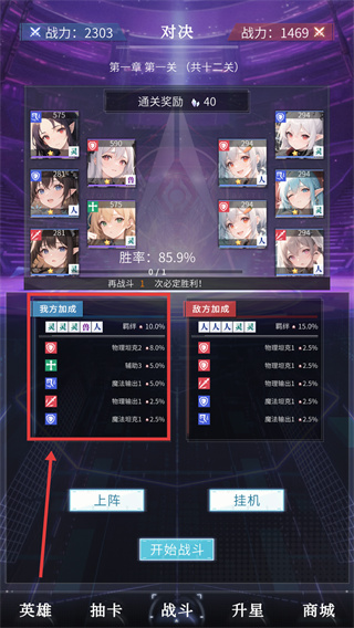 2、查看【我方加成】中的羈絆與職業(yè)加成,搭配后點擊【上陣】,可增強(qiáng)對決戰(zhàn)力。