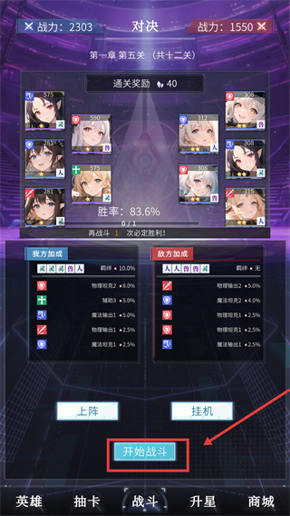 3、確認(rèn)陣容與加成后點擊【開始戰(zhàn)斗】,推進(jìn)關(guān)卡并獲取通關(guān)獎勵。