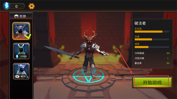 1、選擇【破法者】英雄后,點擊【開始游戲】進入關卡,可先查看其生命值、傷害等屬性適配戰(zhàn)斗。