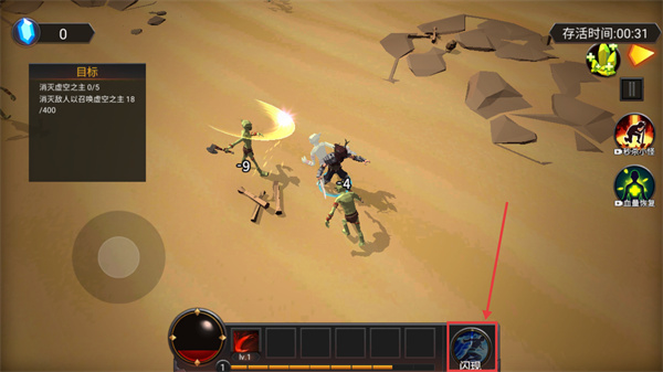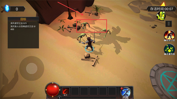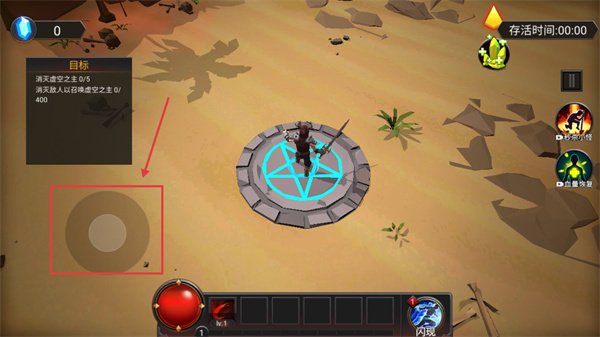2、進入場景后,通過左側移動控件操控角色,目標是完成【消滅虛空之主-0/5】的任務,先積累敵人擊殺數。